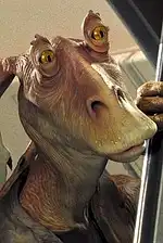 - Джар‑Джар Бинкс (озвуч. Ахмед Бест) — гумоподобный житель Набу, помогает героям.